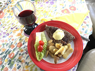 En strålande fin söndag. Vinden är dock fortfarande rätt kylig. Det blev därför lite TV-tittande med bl a gudstjänster och serier. Avslutningen av dagen med kvällsmaten utomhus blev härlig!